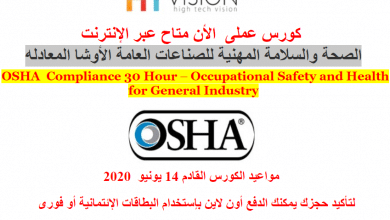 تقدم شركة هاى تك فيجن لاستشارات الأعمال وتكنولوجيا المعلومات كورس الصحة والسلامة المهنية للصناعات العامة الأوشا المعادله OSHA Compliance 30 Hours…
